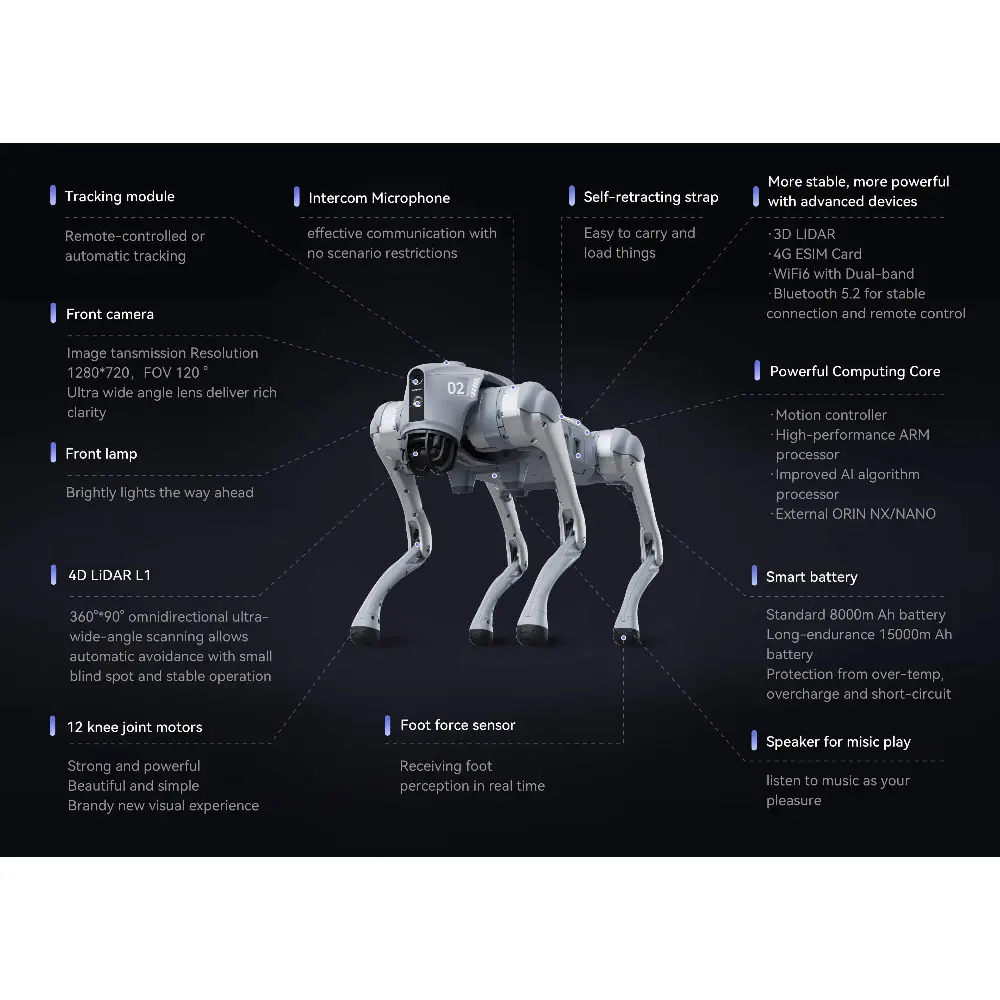 The robot also supports OTA upgrades, allowing it to connect to a cloud-based service for continuous program improvements. The Unitree Go2 AIR Robotic Dog is equipped with high-tech devices, including a wireless module supporting Wi-Fi6, Bluetooth, and 4G, and offers ultra-long battery endurance of approximately 1 to 2 hours.